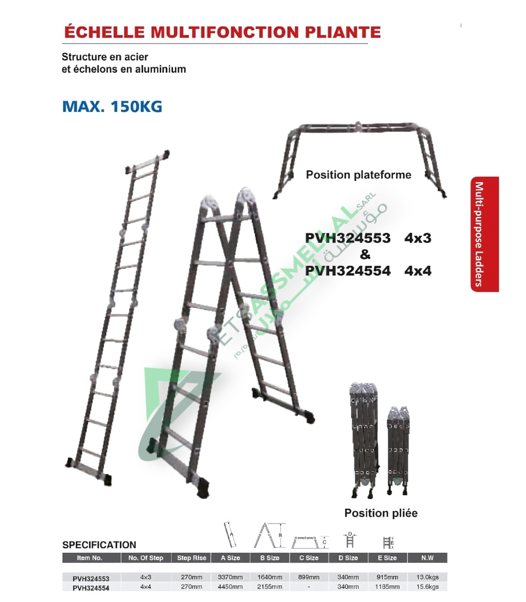 Découvrez nos échelles pliantes articulées en aluminium chez ETS ASSMELLAL à Béni Mellal : Échelle multifonctions 4×3, 4×4, 4×5 barreaux, aluminium haute résistance ultra-léger, articulations verrouillables sécurisées 12 positions, transformation échelle simple/double/échafaudage/escalier, plateforme de travail incluse, stabilité maximale, patins antidérapants caoutchouc protection sols. Polyvalence totale – Sécurité certifiée – Qualité professionnelle – Prix imbattable.